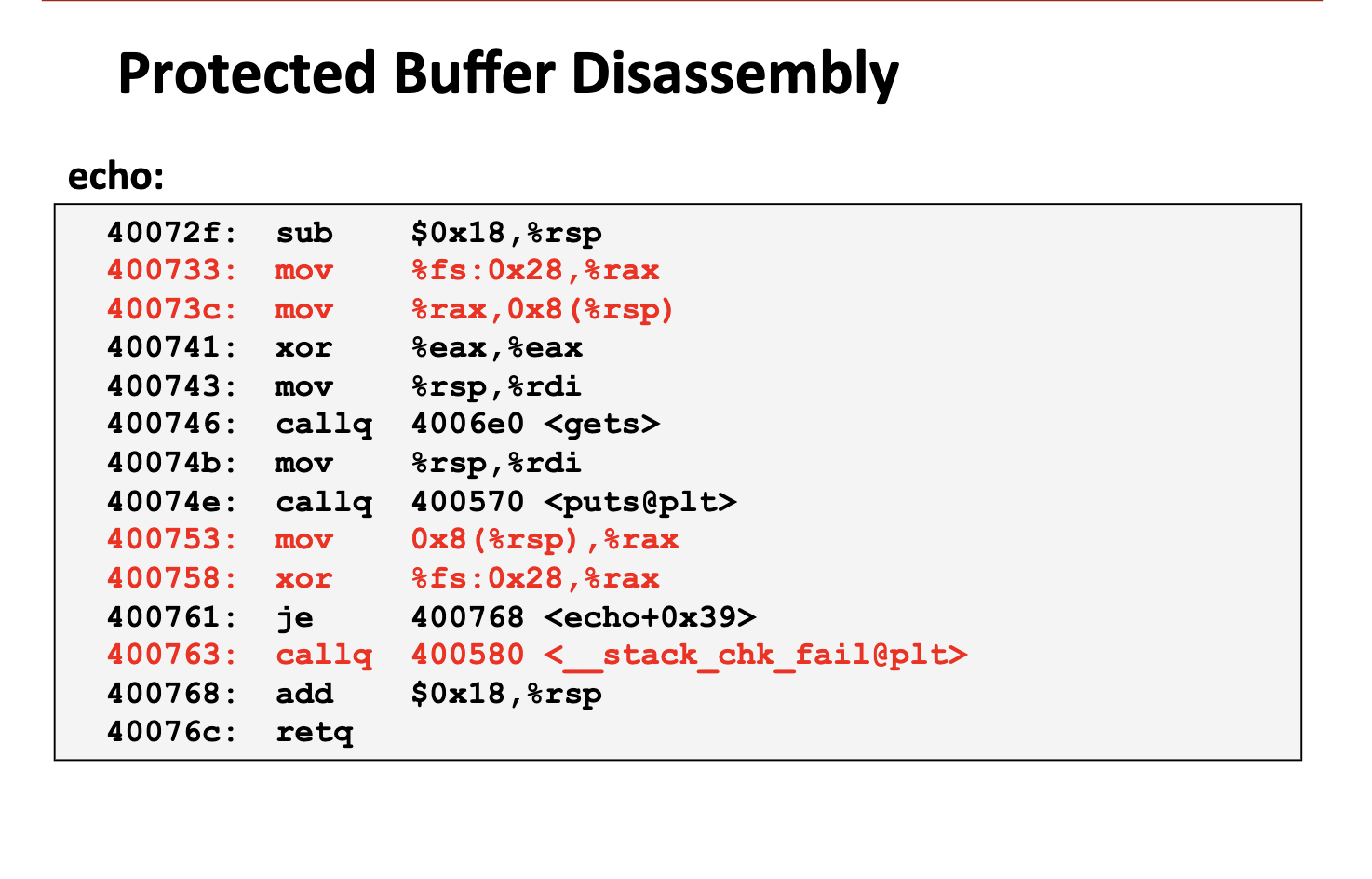 一旦 Buffer Overflow 发生,金丝雀随机数会被覆写,此时程序会抛出 Abort Trap。如果保证严格的独立性,每一个栈帧中间都需要加上金丝雀保护(夹在 Caller Frame 的 Return Address 和旧的栈帧指针 与 Callee Frame 的局部变量存储(缓冲区)之间。